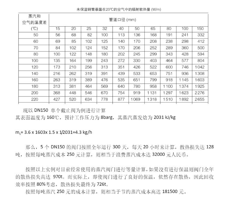 輪胎橡膠、玻璃制品等這些行業(yè)中,蒸汽的能耗降低是企業(yè)競(jìng)爭(zhēng)優(yōu)勢(shì)之一,有時(shí)蒸汽控制的好壞還會(huì)影響生產(chǎn)效率和產(chǎn)品的品質(zhì)。蒸汽閥門的散熱問題是很嚴(yán)重的,我們通過以下公式可以計(jì)算