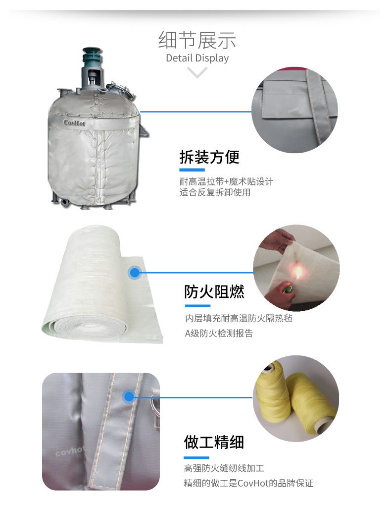 工業(yè)罐體保溫套無需專業(yè)保溫人員,無需專業(yè)培訓,操作簡單快速,表層纖維布不含石棉成分,防油、防水性能優(yōu)良,無纖維飛散問題,環(huán)保、安全、衛(wèi)生。隔熱保溫效果佳,耐溫可達1170度。具有易操作,節(jié)省維護時間和保溫成本。光澤、平整、美觀、使用壽命長、防雨、防酸堿、抗老化,柔軟,拆卸方便,重復使用,節(jié)能環(huán)保。解決了經常拆卸部位難以重新保溫的問題,減少了能源浪費。